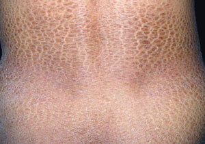 终生存在的鱼鳞病有3种类型:皱褶部位常为半透明黑色或黑黄色的角化过度损害,皮纹明显加深;肢体和下腹等处的板层状鱼鳞病损害;其他损害较轻处表现为大量细薄干燥鳞屑。同一患者常同时具有3种皮损。睑外翻常见。